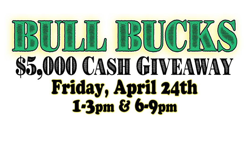 Bull Bucks is a game of luck, and drawing winners will observe the game as it plays. The first set of drawings will run from 1pm-3pm and the drawings will continue from 6pm-9pm, with winners announced every 20 minutes. There will be 4 cash quantities on the board ranging from $50 - $300. When the bull is released, it will traverse the board in a random pattern, knocking off different cash prizes. The player will win the last remaining prize on the board.